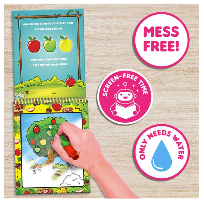 Ocean Friends is an activity book that is perfect for travel days in the car or on the plane. Fill the brush with water and apply it to the scene boards to watch the colors magically appear! Let it dry for 5 minutes and you can do it over and over again. The brush is scented to match the theme of the book too! It's no-mess activity to end the question, "Are we there yet?"