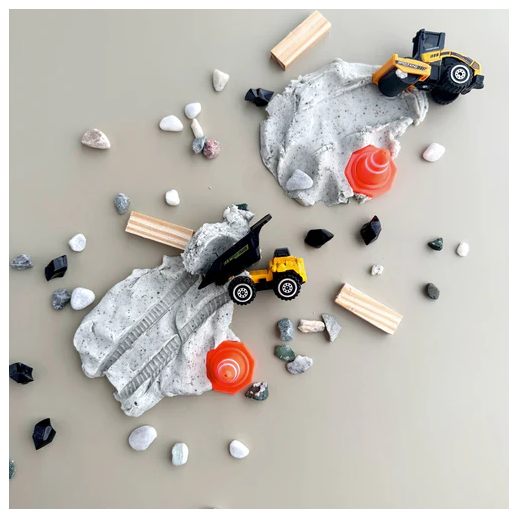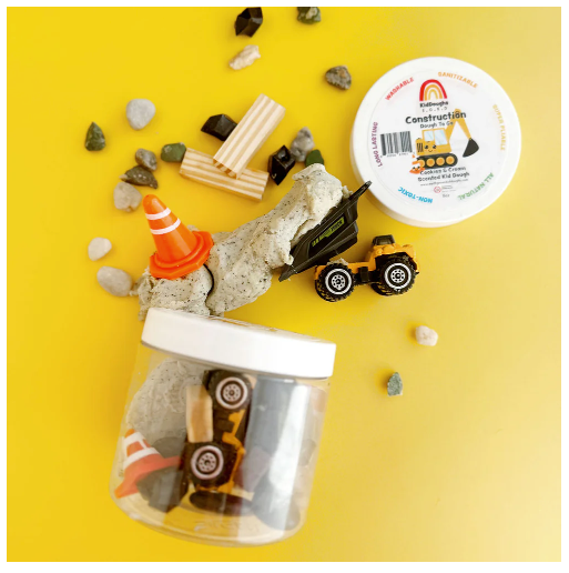Includes: 8 oz Gravel Grey (Cookies & Cream) KidDough, Construction Vehicle, Construction Cone, Road Signs, Mini Lumber Pieces, Black Acrylic Rocks and Natural Stones.