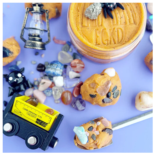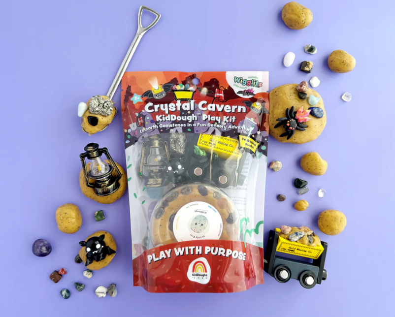 Includes: 8oz Terracotta Red (Prickly Pear) KidDough filled with rocks and gemstones, Bat Figurine, Mining Cart, Shovel, Gold Nuggets and Polished Rocks