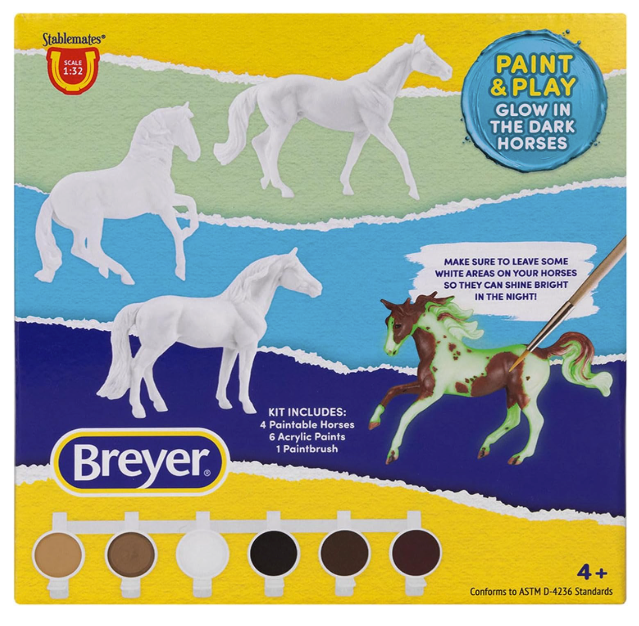 Whether you are a beginner or an experienced painter, the possibilities are endless. Horses come in all sorts of colors and patterns, and these horses come with a special feature: they glow in the dark! Let your imagination gallop and create luminous works of art that not only look amazing in the day but also at night. Includes 4 different horse breeds (Thoroughbred, Morgan, Lusitano, Arabian), 1 paintbrush, 6 paint pots, and 1 tips guide.