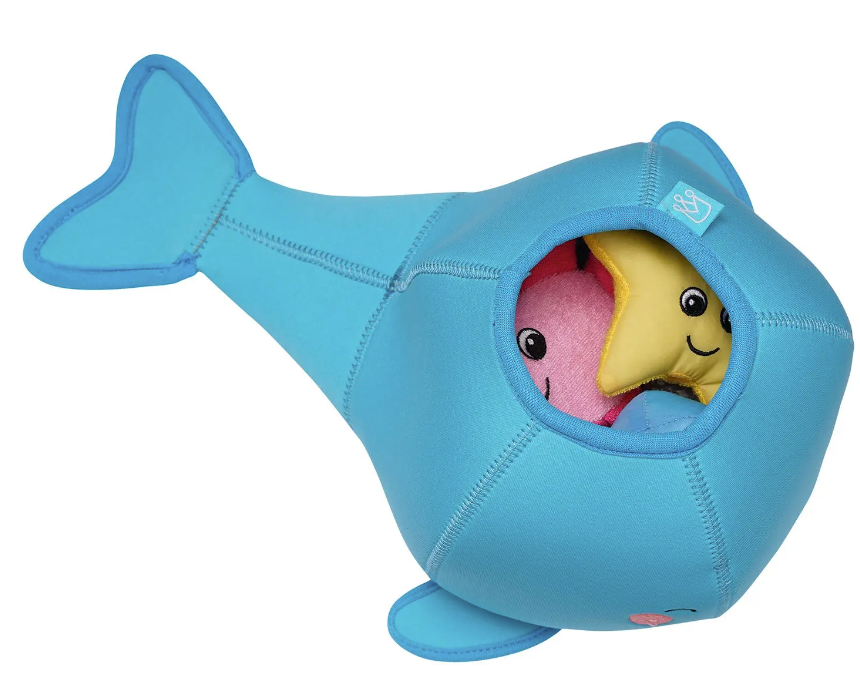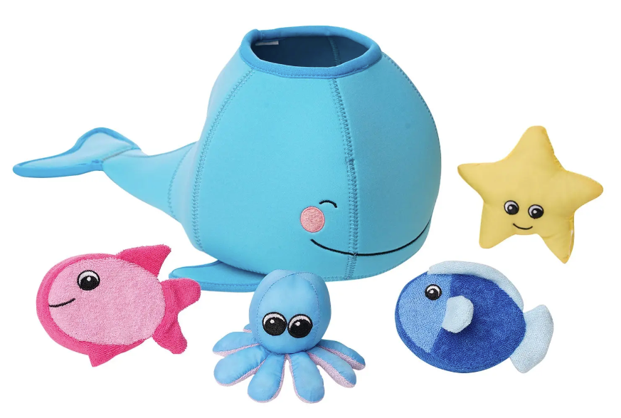 Five-piece bath-time play set includes one neoprene whale storage container that floats and four sea creatures. Quick-dry sea creatures include 1 blue and 1 pink terry cloth sponge fish, an octopus and a starfish squirter. Encourages cause and effect learning, motor development and fill and spill play. Care instructions: rinse and squeeze out excess water; air dry.