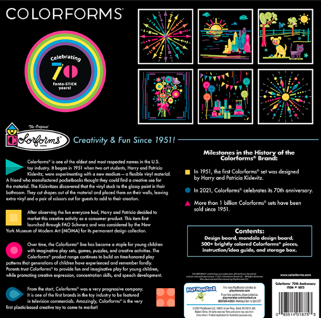 Colorforms have inspired creative expression and fun for 70 years! Celebrate this important milestone with the Colorforms 70th Anniversary Set! The classic, repositionable shapes provide endless opportunities for imaginative storytelling, and the countless combinations enhance learning through open-ended play. With pieces that Stick Like Magic, it’s more fun to play the Colorforms way!