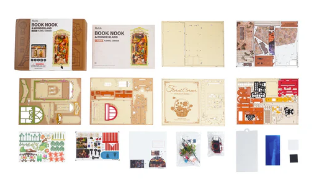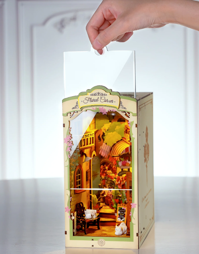 This book nook kit features flower shops, each brimming with vibrant blooms, hanging baskets, and window displays bursting with color. Cobblestone paths and charming storefronts create an inviting atmosphere, perfect for adding a touch of nature's beauty to your bookshelf. With intricate details like shop signs, potted plants, and delicate floral arrangements, this kit captures the essence of a peaceful, hidden street where flowers are always in full bloom. Complete with soft lighting, it transforms your shelf into a serene escape.