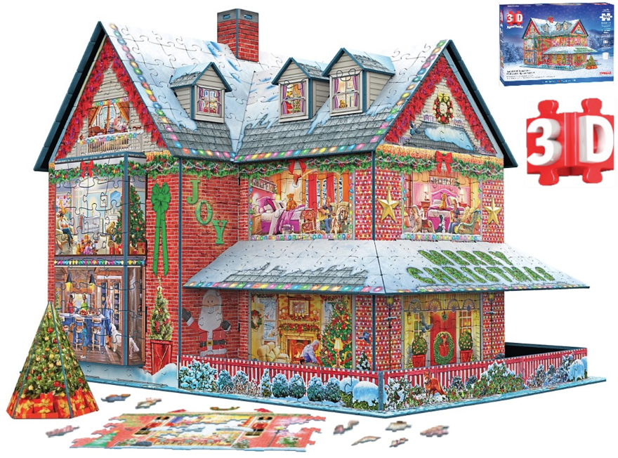 3D Christmas House features 1100 traditional puzzle pieces assembled to construction house. Contents include 9 puzzle baggies, adhesive glue sheets, glue support bars, and illustrated instruction booklet. Assembled house dimensions 13.75x10.5x11 in. Patented innovative design by Eurographics with unique puzzle piece shapes and interlocking function. Puzzles made from 100 percent recycled blue board.