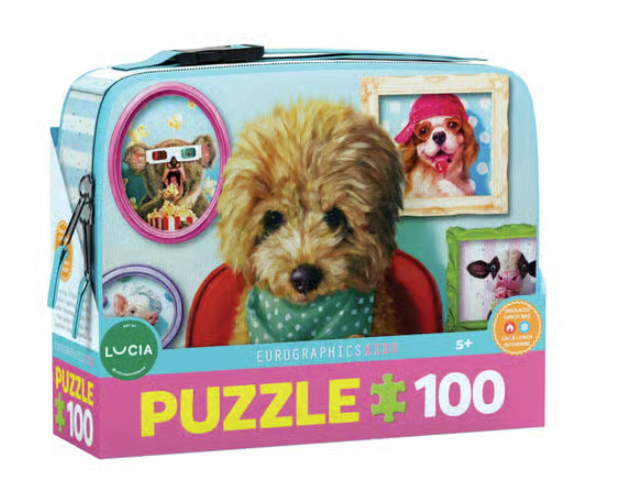 Dinner Time by Heffernan Puzzle in a Lunch Box 100 piece children puzzle. Puzzle size 13 x 19 in. Lunch box size 10.5 x 8.25 x 3 in. Lunch box is insulated and easy to clean. High quality European Blueboard.