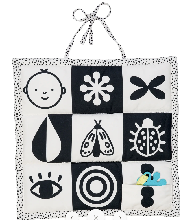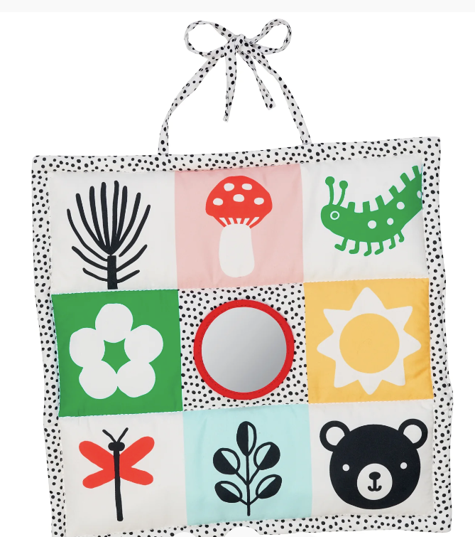3-in-1 reversible playmat can be laid flat for tummy time or folded into a triangle, clung to magnetic surfaces, or hung on a headrest!