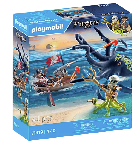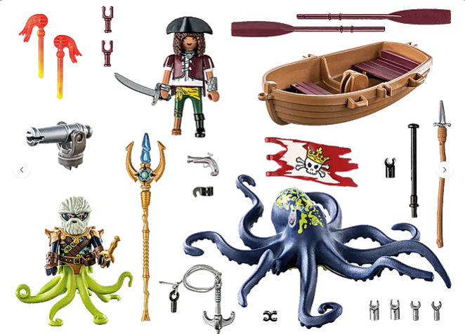 Beware, for the giant octopus is approaching! The pirate is trying to escape in his rowboat, but the giant squid and its companion Deepers are faster. They catch up to the boat, and the octopus gives the pirate a cold shower with its tentacle. The pirate doesn't even have time to load his cannon. It's better not to mess with this extraordinary sea creature! With imaginative characters and detailed equipment, the Pirates playsets from PLAYMOBIL offer hours of fun for pirate fans aged 4 and up. The giant octopus has a water-spraying function. The pirate boat floats and can accommodate one PLAYMOBIL figure.