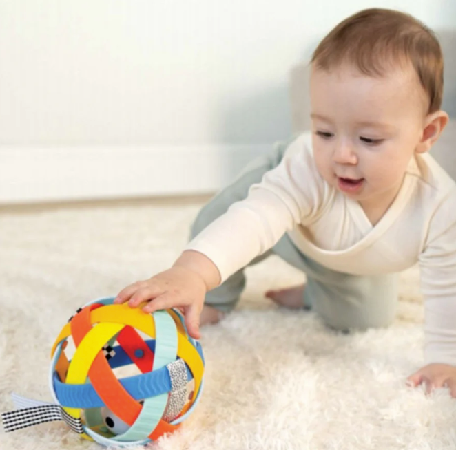 A sensory experience rolled into a ball of flexible, squeezable, rattle-filled fun! The Blissful Ball is made of soft bendable plastic bands drenched in color and covered in texture. It's easy to grasp, squish and teethe for little hands and engaging minds. Four textured black and white ribbons are attached to various bands for added tactile enjoyment and visual interest. The black and white spotted ball in the center moves freely inside the ball, making a soft rattling sound with every roll, shake and bounce. The Blissful Ball is a perfect toy for sensory play, fostering visual tracking, motor development and teaching cause and effect.