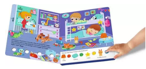 In the evening, the children go to bed and calm reigns in the house. But in the city, in the garden, in the forest and on the farm, there are also many things that happen at night. Can you find all the cats, hedgehogs and owls? The lights will help you! Just press the button and the lights reveal where animals and objects are hiding. A Seek and Find book with lights to learn to count and find colorful images!