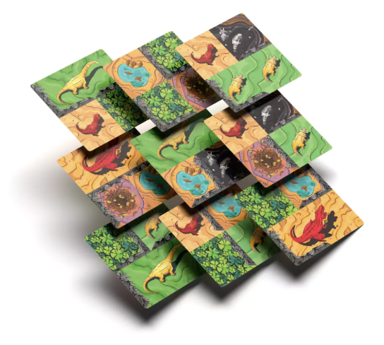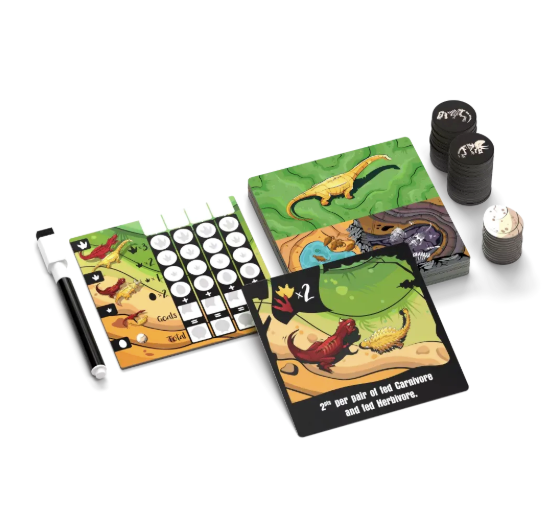 Chomp is a quick game where you only get eight turns. Make the most of them! Every card in the game has a point-scoring goal on one side and a dinosaur landscape on the other side.
