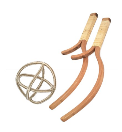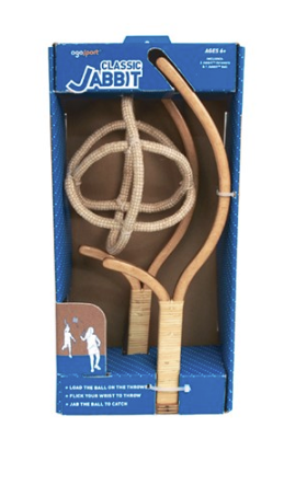 Use the wooden Jabbit launchers to throw and catch the rope ball! Master the Jab! The curved, hooked launcher allows you to toss and catch the balls in many different ways! Set includes two Launchers and one Rope Ball.