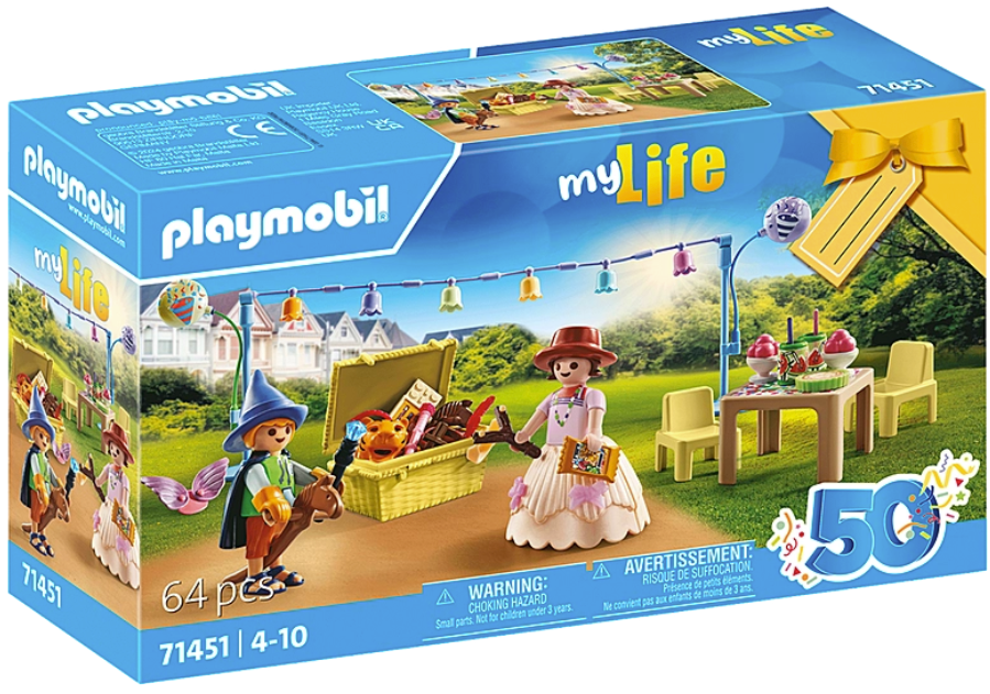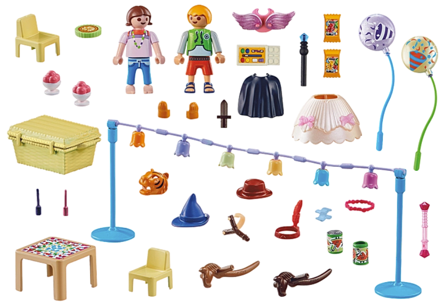 Get ready for the craziest costume party of all time with the brand-new PLAYMOBIL Costume Party Gift Set. And the best part? You can skip the gift wrap because it comes in a stylish packaging! The birthday child is inviting you to the ultimate dress-up party, and with the many costumes available, the kids can step into any role imaginable. Whether it's a magician with a hat, cape, and wand, a princess with a skirt, headband, and sceptre, a cowboy with a hat and hobbyhorse, or an Indian with a headband, feather, and slingshot - the possibilities are endless. There's even a tiger with a mask and glove attachments, and a sweet angel with a collar and wings. And when hunger strikes, the little party guests can take a seat at the kids' table and indulge in delicious strawberry ice cream, cake, candies, and juice from the can. The foldable basket provides room for costumes with accessories. With this gift set, every party turns into a wild adventure where kids can slip into various roles.