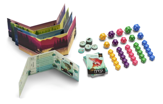 Secretly wager dice behind a player screen. Then, all players reveal their dice simultaneously. If you bid less dice, you get to go first! But, it's easier to catch fish with more dice.