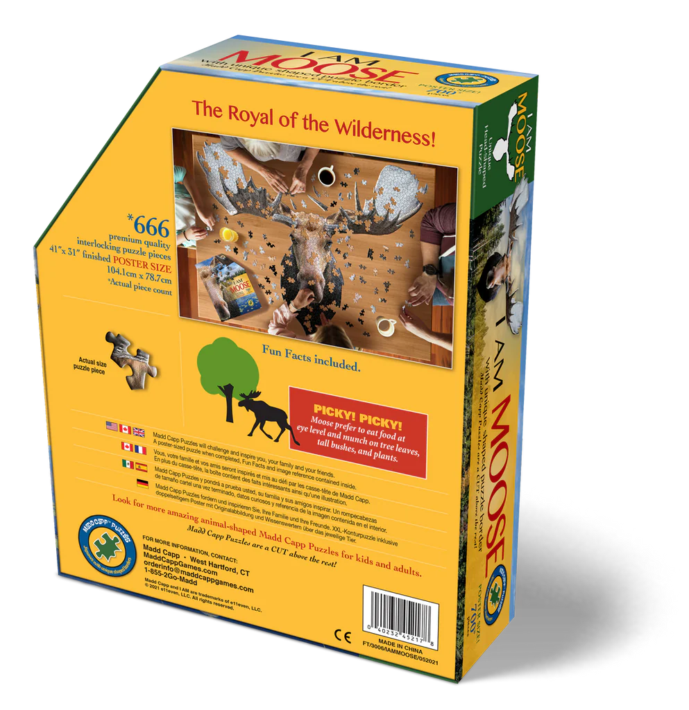 Each puzzle comes with an educational Madd Capp Fun Facts booklet. On one side is a fold-out puzzle image to hang as a poster or use as a reference. On the flipside is a wealth of amazing facts. Did you know, for instance, that the moose is the official state animal of Maine?