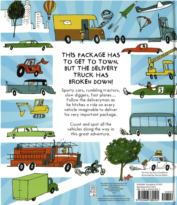 Oh, no! A package has to get to town, but the delivery truck has broken down! Follow a delivery man as he hitches a ride on every vehicle imaginable to deliver a very important package. Little ones will love counting and spotting all the vehicles along the way including sports cars, rumbling tractors, slow diggers, fast planes, and more! An educational and entertaining great adventure filled with “I Spy with My Little Eye” activities for hours of fun.