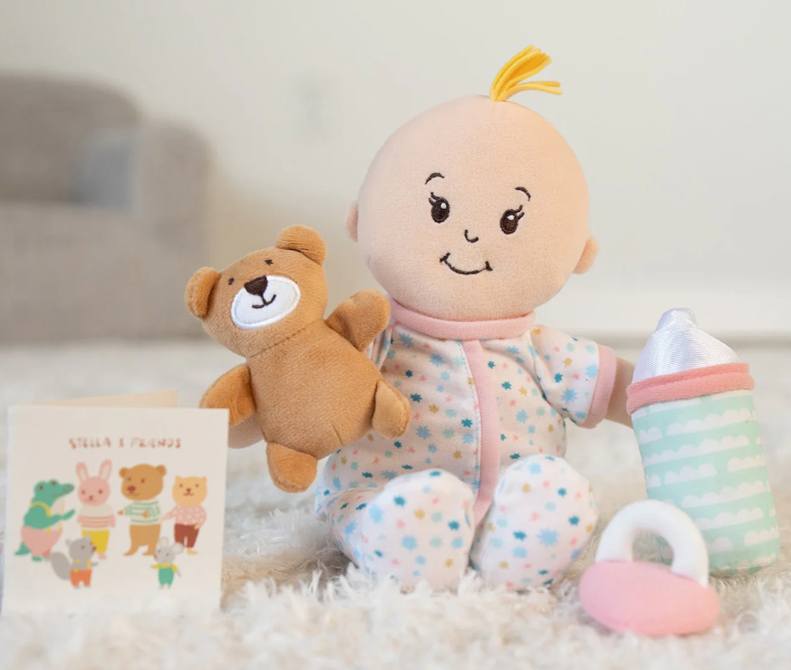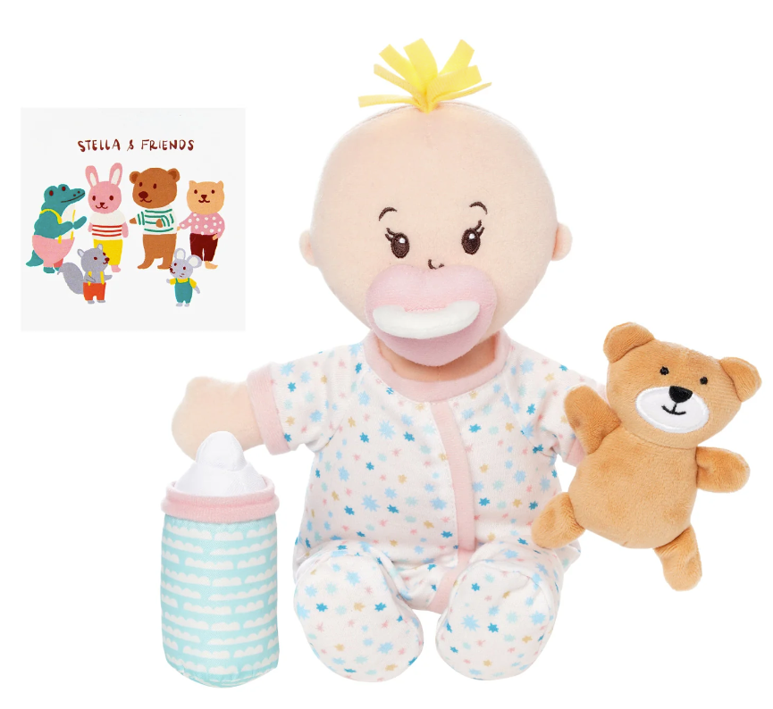 The Love, Stella Sleepy Time dolls are the perfect size for holding, hugging, and nurturing role play to foster social and emotional development. Dolls are 100% soft with a soothing light lavender scent. The doll's bottom is lightly weighted and designed to sit unassisted - perfect for playtime! Sleepy Time doll has embroidered features, fabric hair, a plump tummy, and a cute little belly button. The set includes a signature magnetic pacifier, a magnetic bottle, a teddy bear companion, and a mini paper bedtime picture book. Clothes are removable and feature hook-and-loop closures for supporting elementary dressing skills.
