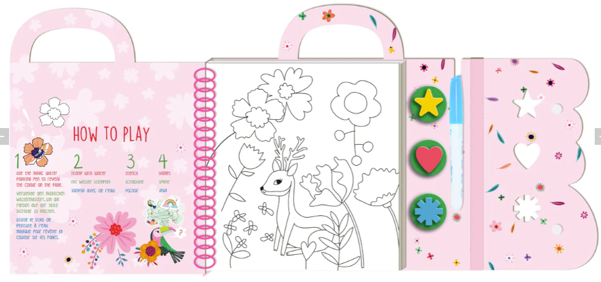 The Magic Water Painting - Fantasy Garden Book comes with 8 magic water painting pages, a refillable water pen, a reusable stencil and 3 water stamps. There are also some fun games too! Multiple fun activities contained in one book!