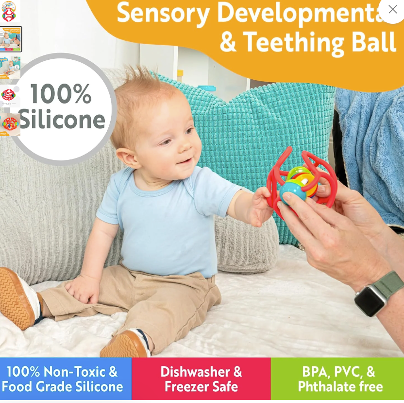 - Tactile Sensory Ball: This baby teether ball can be stretched, squished, grasped, held, and chewed, offering a tactile sensory experience for babies and toddlers.