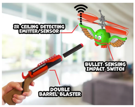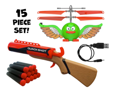 One of the coolest interactive toys has arrived! The Top Secret Toys® Hovertech® Quack-Shot Self-Flying Target Game is a great game that simulates the excitement of duck hunting. The self-flying duck drone uses sensors to float below the ceiling, so you don't have to worry about scuffs and scrapes. Your young hunter then takes hold of the double-barrel dart shotgun, takes aim, and takes their best shot.