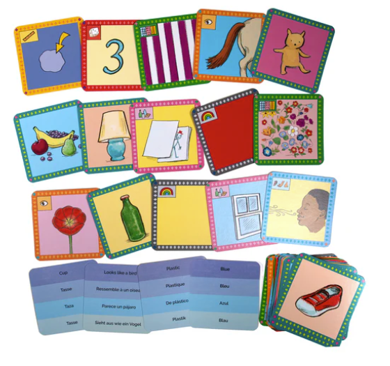 Each card has the item/description in 4 languages:  English, French, Spanish and German