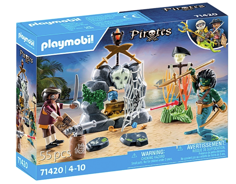 Embark on a treasure hunt with the fearless pirate. The treasure map has led the buccaneer to the mysterious Crystal Skull Island, where a valuable crystal skull artifact is said to be hidden. But before he can obtain the treasure, he must first find the right path and navigate past the guardian of the island. The PLAYMOBIL set includes two PLAYMOBIL figures, a rock hideout with a movable spider web door, two stones with path markers, a functioning cannon, and many other fantastic extras. With imaginative characters and detailed equipment, the pirate playsets from PLAYMOBIL offer hours of fun for pirate fans aged 4 and up.