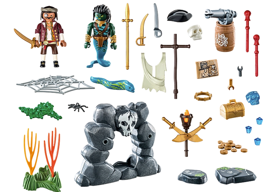 In the darkness of the underwater cave, the markings on the rocks guide the pirate to the hiding place of the Crystal Skull artifact. He pushes aside the spider's web and reveals the treasure. But beware! A moray eel Deeper emerges from the water and attacks the buccaneer. Can he be driven away with the help of the cannon? Includes rock prints that glow in the dark.