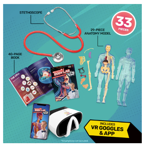 This interactive activity set takes us on a magical journey through the human body as we discover the wonders behind the our bodies! Explore the various bodily systems that allow us to function. This activity set includes a 40 page book, along with an anatomical human body model. We've also included a super cool stethoscope, along with VR goggles to magic school bus your way into the bloodstream.