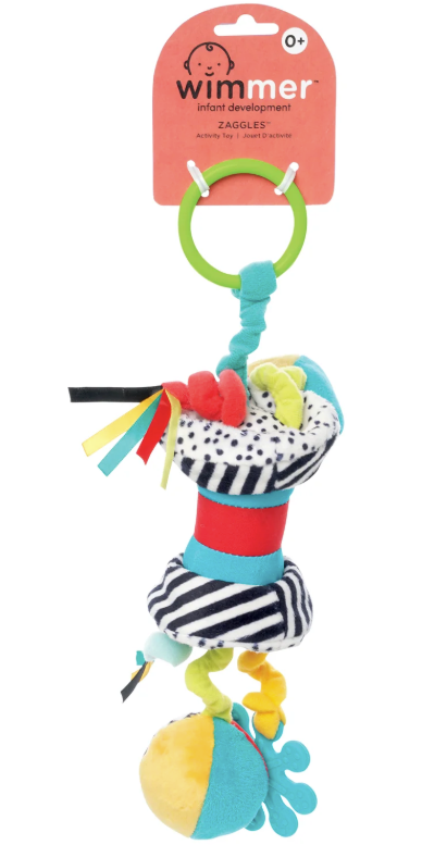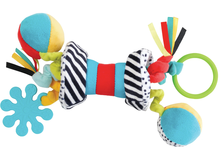 Easy to hold and bursting with play value. Features include a chime, squeaker, crinkle, teethers and more! All inside this take-along activity toy for baby to explore.